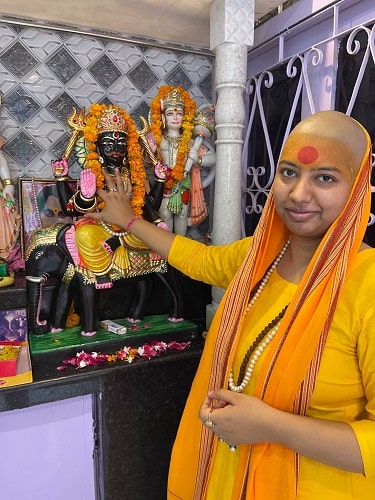 • At 14, she took her deeksha under her guru Rajneesh Rishi Ji. After her deeksha under her guruji, she devoted herself completely towards God. After around four years, she got married to lord Krishna. When she was 28, she renounced the world and became a sanyasi. After becoming a sanyasi, she also gave up her hair and decided to remain bald all her life.